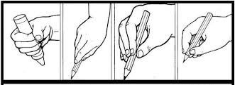 É possível observar uma criança com uma pega do lápis avançada (imagem nº4) a regredir para uma pega elementar (imagem nº1), pelo simples facto de mudar de mão.